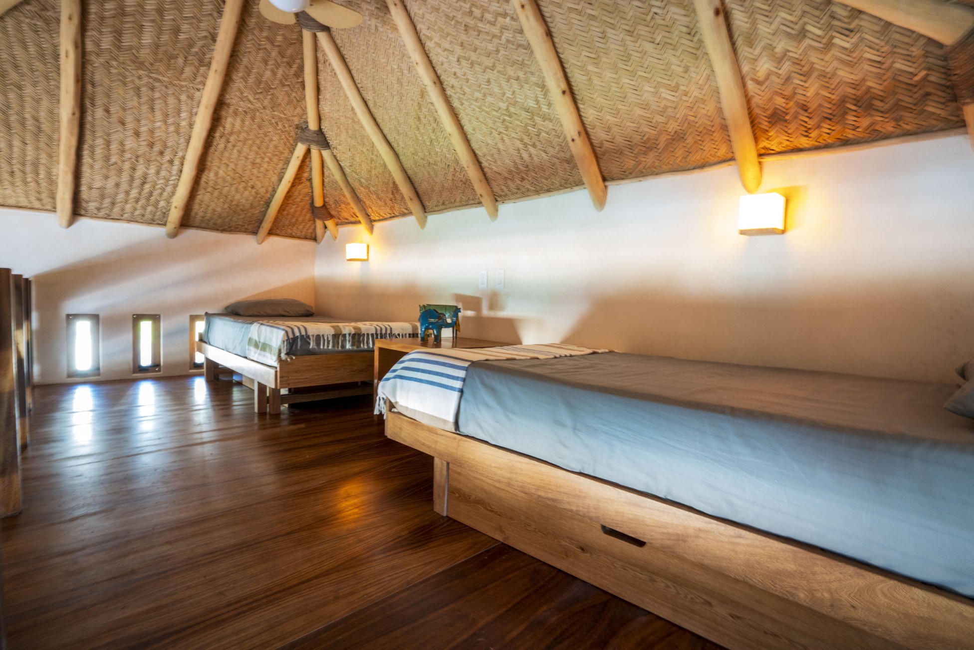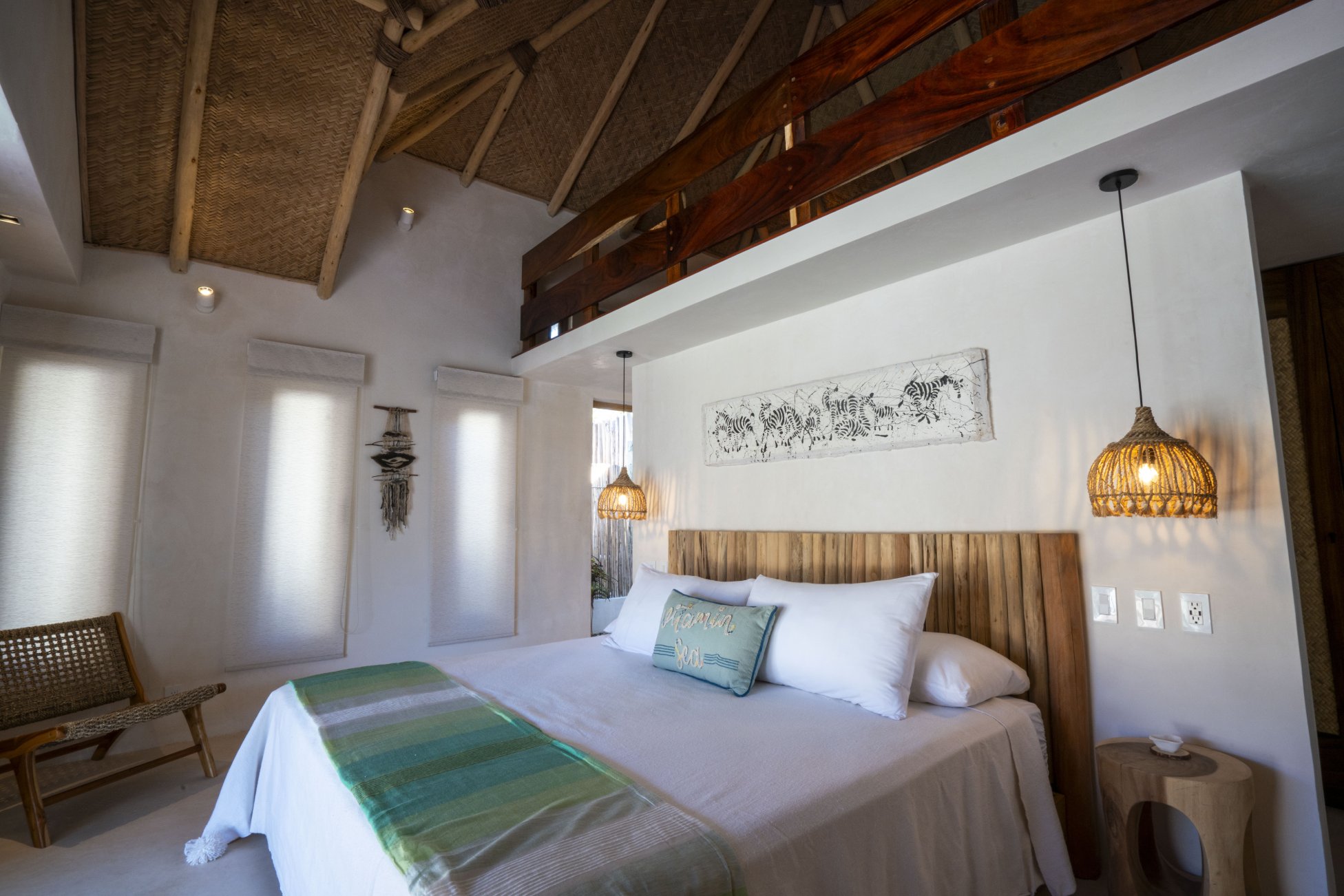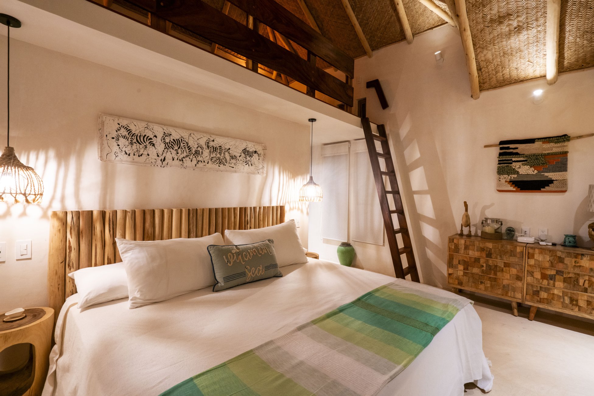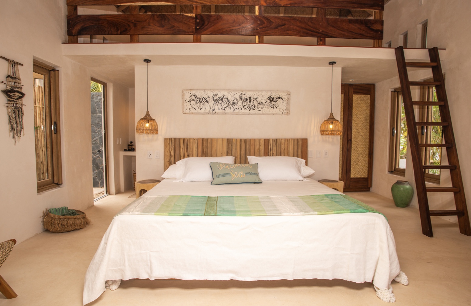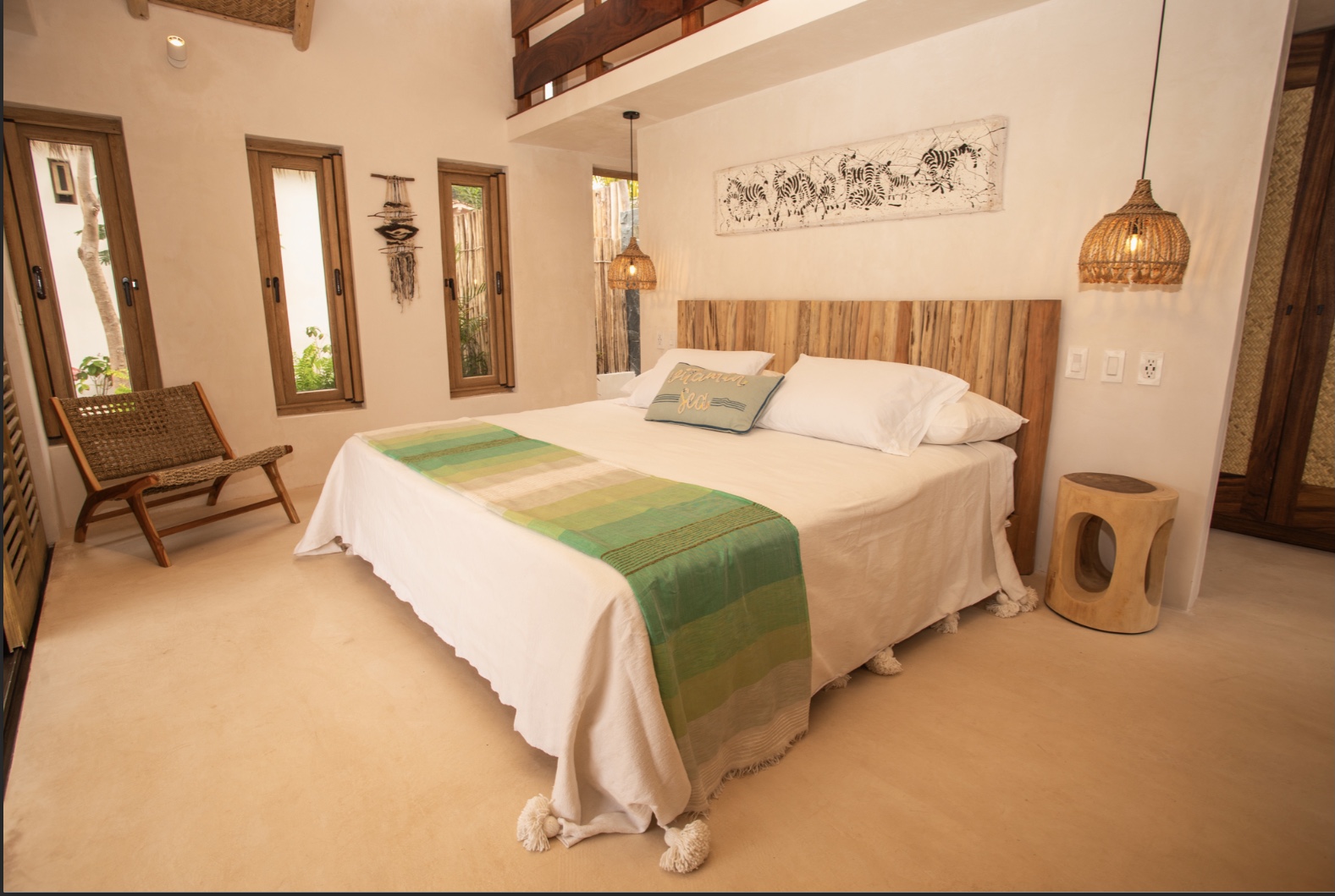 Spacious and versatile, Casita 1 is perfect for families or groups, sleeping two to six guests. It features a king bed alongside two double trundle beds, offering both comfort and flexibility. The en-suite bathroom includes a single vanity, a rain head shower, and a charming outdoor shower. A private patio completes the experience, inviting moments of relaxation under the Mexican sky.