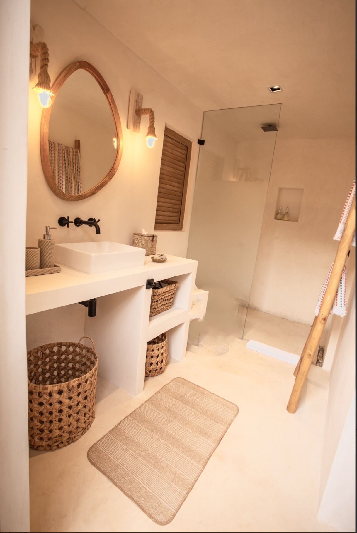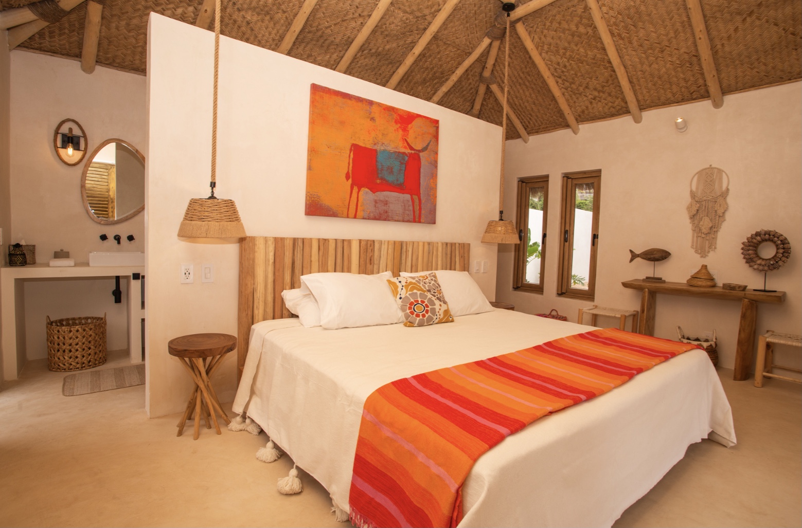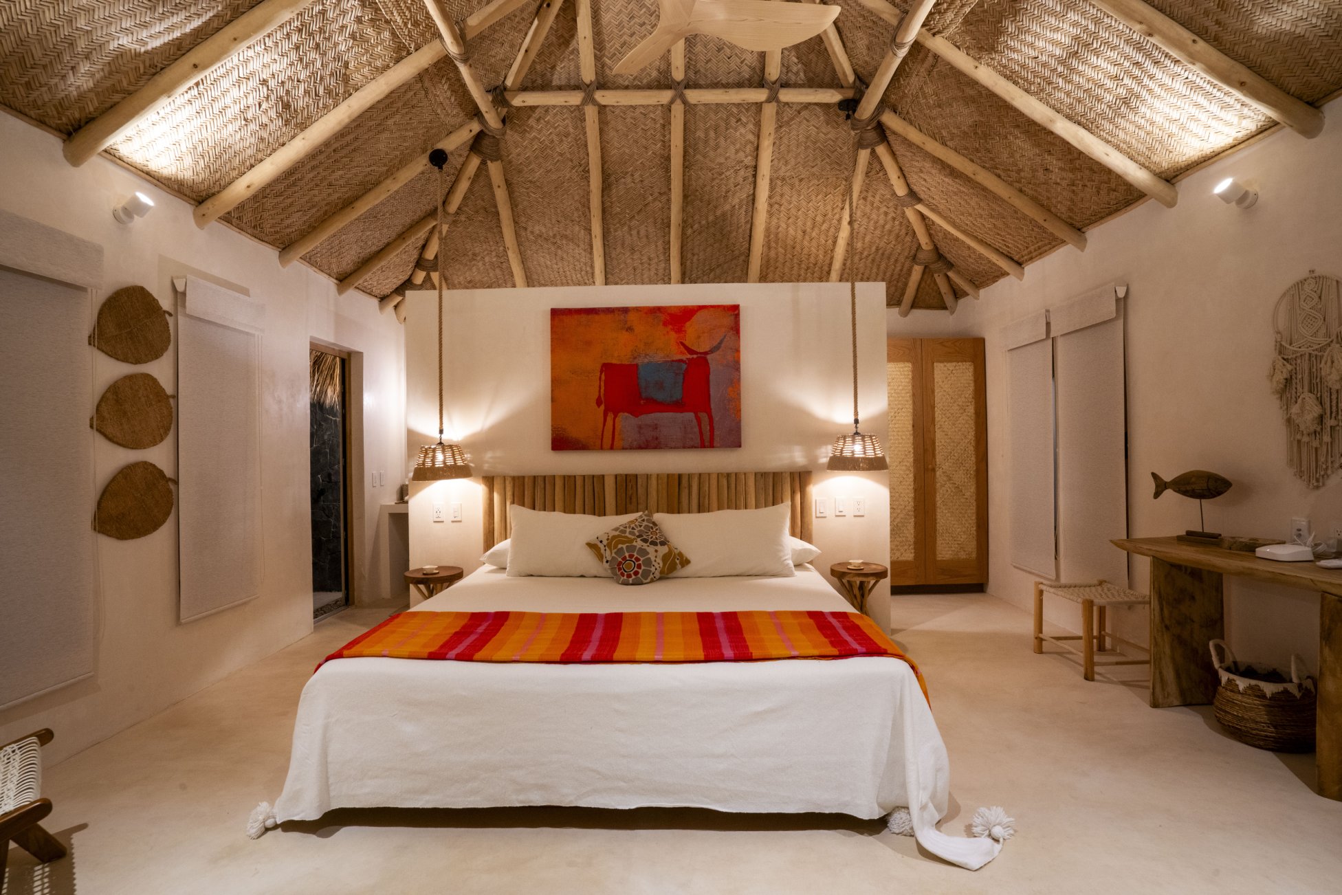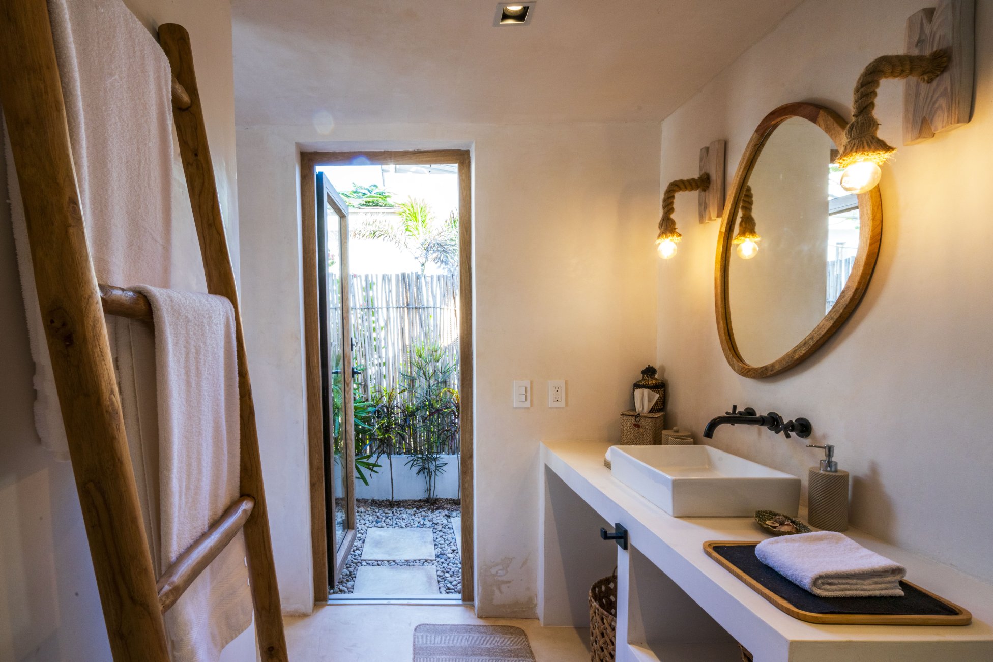 Casita 2 offers a serene escape with a king bed and accommodations for two guests. The en-suite bathroom is thoughtfully appointed with twin vanities, a rain head shower, and an invigorating outdoor shower, inviting you to reconnect with nature. A private patio extends the living space outdoors, providing a peaceful setting to relax and unwind.